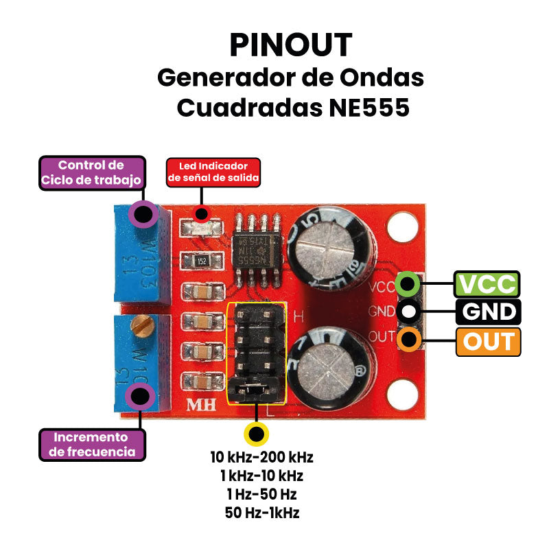- Con potenciómetro ajustable para controlar la frecuencia de salida