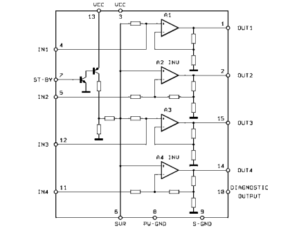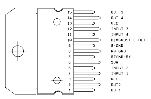 Circuito Integrado TDA7379, amplificador de potencia de audio de 2 x 38 W / 4 Ω. Él TDA7379 es un nuevo amplificador de procesador de audio de clase AB con tecnológica capaz de funcionar bien en DUAL BRIDGE o QUAD SOLO ENDED.