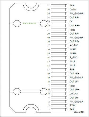 El TDA7562 es un nuevo amplificador de radio de coche QuadBridge con tecnología BCD en un paquete Flexiwatt27V especialmente diseñado para aplicaciones de radio de coche. Gracias a la etapa de salida DMOS, el TDA7562 tiene una distorsión muy baja que permite un sonido claro y potente. Este dispositivo está equipado con una matriz de diagnóstico completo que comunica el estado de cada altavoz a través del bus I2C. La posibilidad de controlar la configuración y el comportamiento del dispositivo mediante el bus I2C hace que el TDA7562 sea una máquina muy flexible.