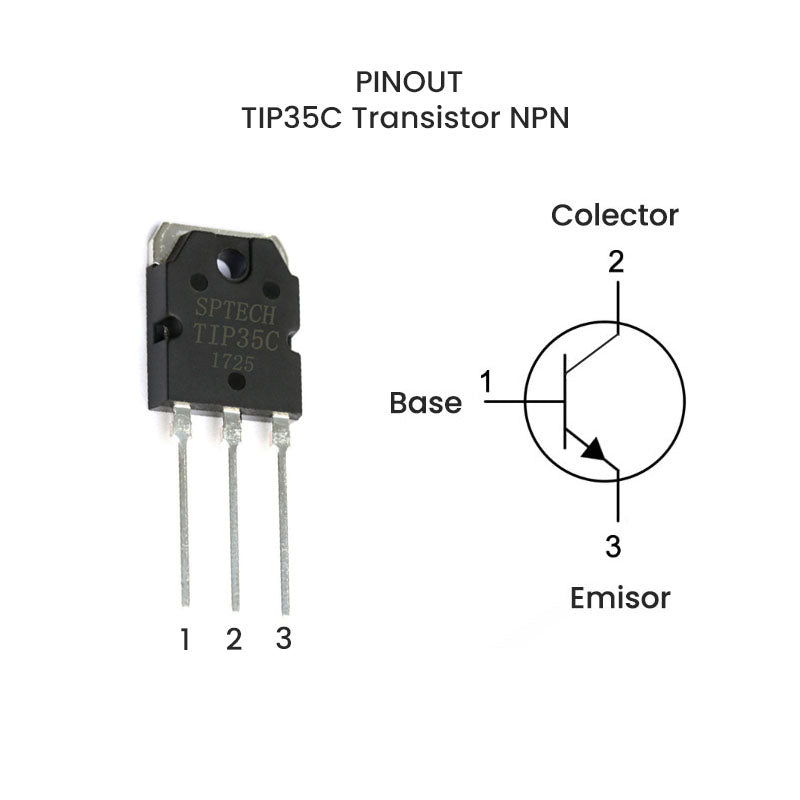 El TIP35C es un transistor NPN que se utiliza principalmente en aplicaciones de amplificación de potencia y conmutaciones; maneja un voltaje colector y emisor con la base abierta de 100V y corrientes en modo continuo IC de 25A y hasta 40A en pico. El TIP35C tiene como complemento al TIP36C, el cual es un transistor PNP que se puede usar en aplicaciones donde se necesite un par complementario NPN-PNP para diseño de etapas de salida push-pull, entre otras aplicaciones.