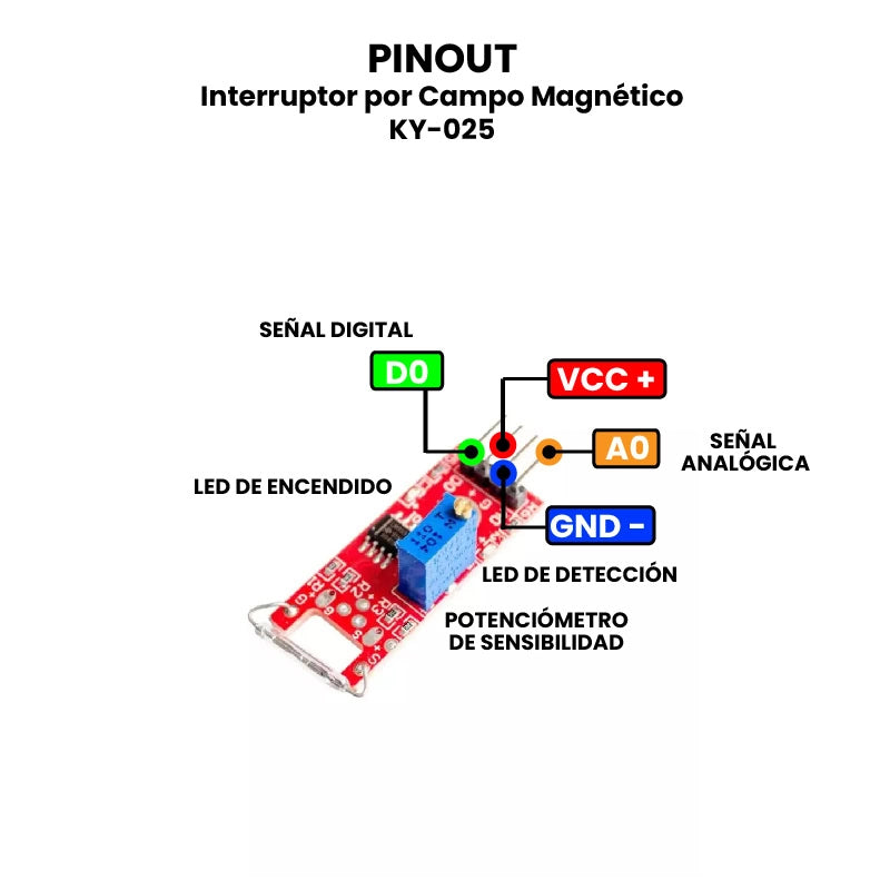 Entre sus principales usos se encuentran la detección de posición, la implementación de interruptores sin contacto, sistemas de seguridad, conteo de objetos, y control de acceso. Se utiliza comúnmente en proyectos de robótica, domótica, automatización industrial y sistemas de monitoreo, gracias a su capacidad para actuar como interruptor activado por campos magnéticos. El KY-025 es compatible con varias tarjetas de desarrollo populares, como Arduino (Uno, Nano, Mega), ESP8266, ESP32 y Raspberry Pi, lo que facilita su integración en una amplia variedad de proyectos electrónicos y de automatización.