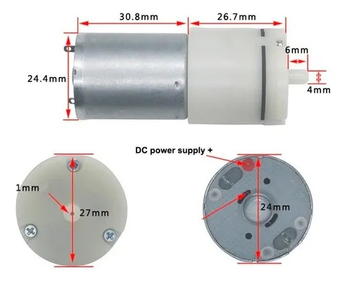 La bomba de aire es una mini bomba eléctrica con capacidad de flujo de 1 a 3.5 litros por minuto, incorpora una entrada y una salida de agua con diámetro de 4.2 mm aproximadamente, de igual manera cuenta con 2 soportes de fijación y pines de alimentación, el motor integra referencia para identificar el pin positivo.