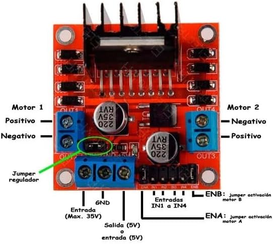 El módulo L298N es un dispositivo que permite controlar el sentido de funcionamiento de motores a una corriente de salida por canal de hasta 2 A. Este módulo cuenta con un disipador de calor acorde a este driver, sus características de diseño le permiten un rendimiento anti-interferencia excepcional, puede llegar a trabajar hasta con un nivel de tensión de entrada de 46 V, aunque por cuestiones de seguridad se recomiendo usar niveles de tensión algo debajo de este valor límite. Puede llegar a manejar un motor paso a paso de dos fases y cuatro fases, o dos motores de corriente continua. Este módulo incluye un regulador de voltaje 78M05 para obtener la energía de alimentación del dispositivo, sin embargo, cuando se superan los 12 V, se sugiere usar una fuente de poder externa de 5 V como fuente de alimentación digital y deshabilitar el jumper de 12 V. Este módulo tiene gran capacidad de filtrado de ruido, cuenta con un diodo de protección ante corriente inversa, haciendo que su funcionamiento sea más estable y fiable.