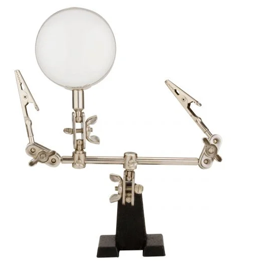 Mini atril con lupa de base metálica ideal para diseñadores de circuitos electrónicos, estudiantes y talleres en general, te permite tener las manos libres para que puedas trabajar con ambas manos en tarjetas o aparatos electrónicos, además la lupa amplía la visión, permitiéndote trabajar con mayor exactitud.